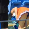 チアはアクションや露出が大胆で、大きく膝を上げたり、コンバットマーチで足を開いたりすると、超ミニのひらひらへそ出しルックから、フリルのアンスコが丸見えになっていました。特に、ラインダンスなどの踊りでは、ヒップを揺すったりターンをしたり、また、赤スコートに着替えての演技もあり、もう最高でした』