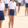 ・動きのあるネイビーのスカートにスニーカーを組み合わせたモデルさんのスカートが風でふわりなパンチラ