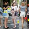 公衆の面前で肌も露わなミニスカートの中を覗き見るローアングルからのパンチラ。